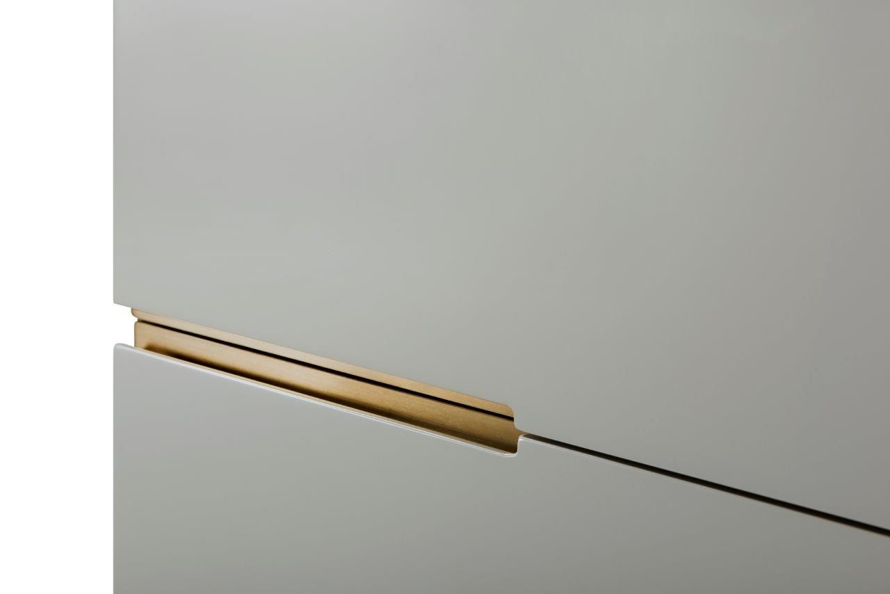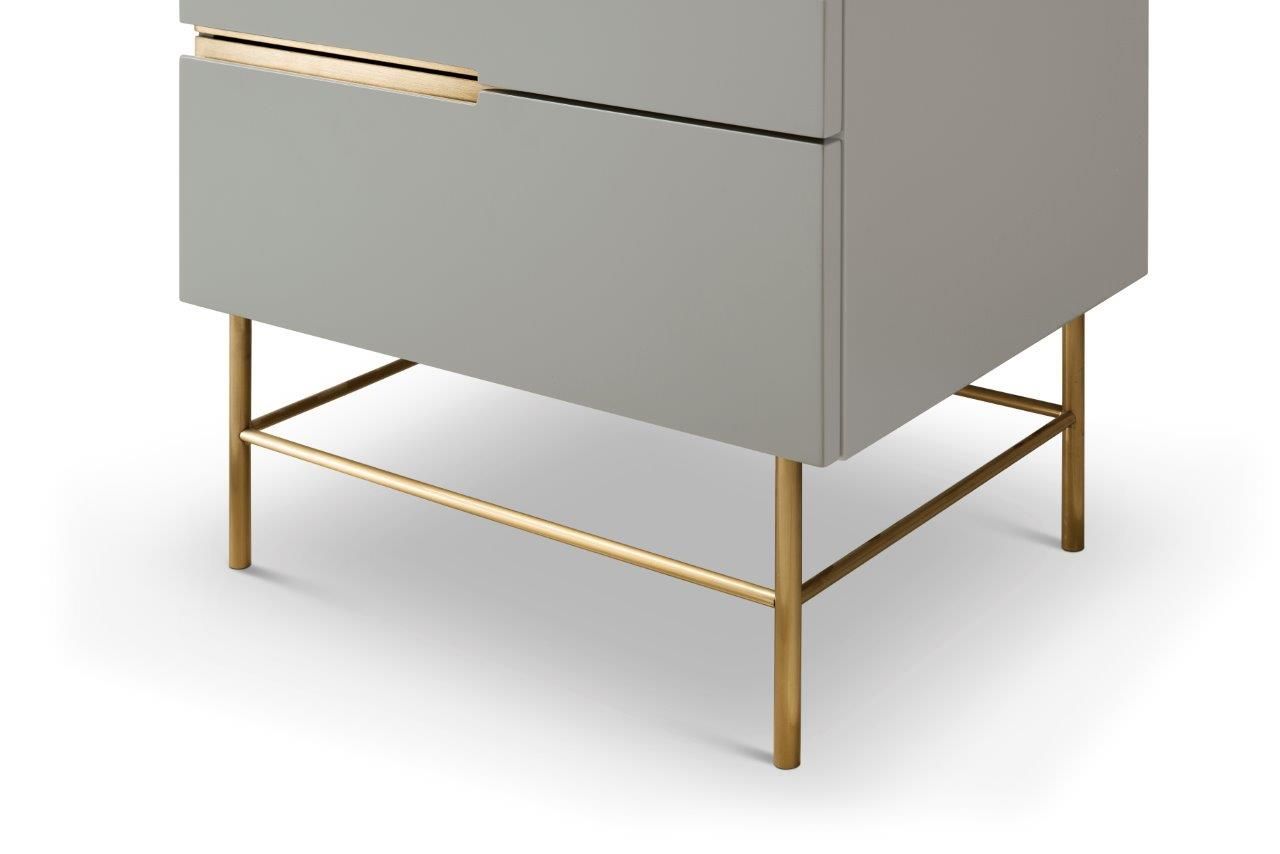 A six drawer tall narrow chest in grey with brass frame and accents