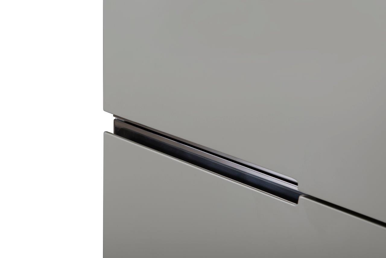 A six drawer wide chest in grey with dark chrome frame and accents
