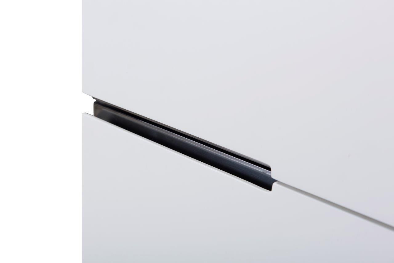 A six drawer wide chest in white with dark chrome frame and accents