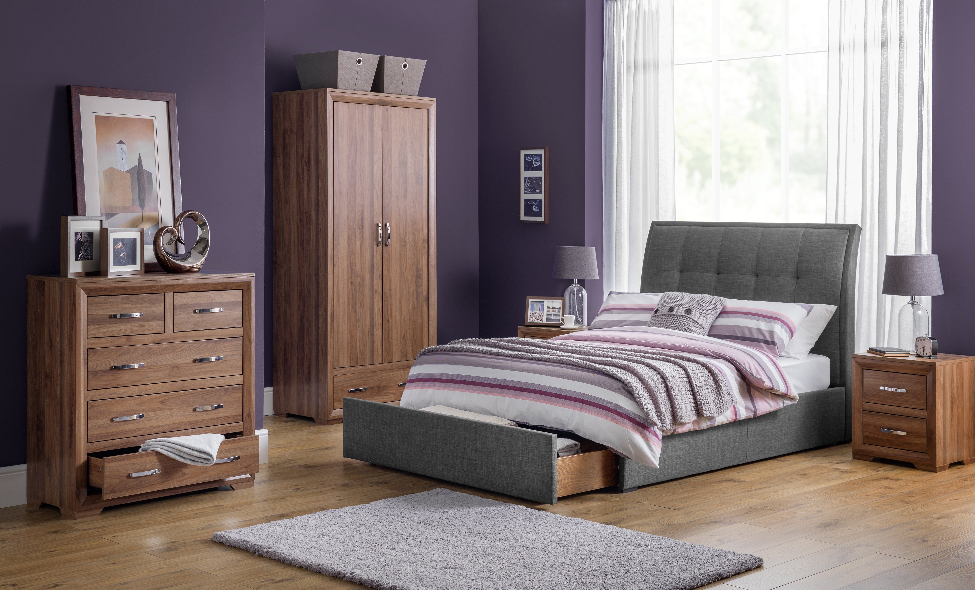 An elegant two drawer side table cabinet finished in a beautiful walnut foil. It features a distinctive, attractive, mitred inset frame around its front surface and is accented by chic chrome handles. The drawers run smoothly on all metal runners. All internal finishing is in a matching walnut foil. Part of the Buckingham side table furniture range from Julian Bowen.