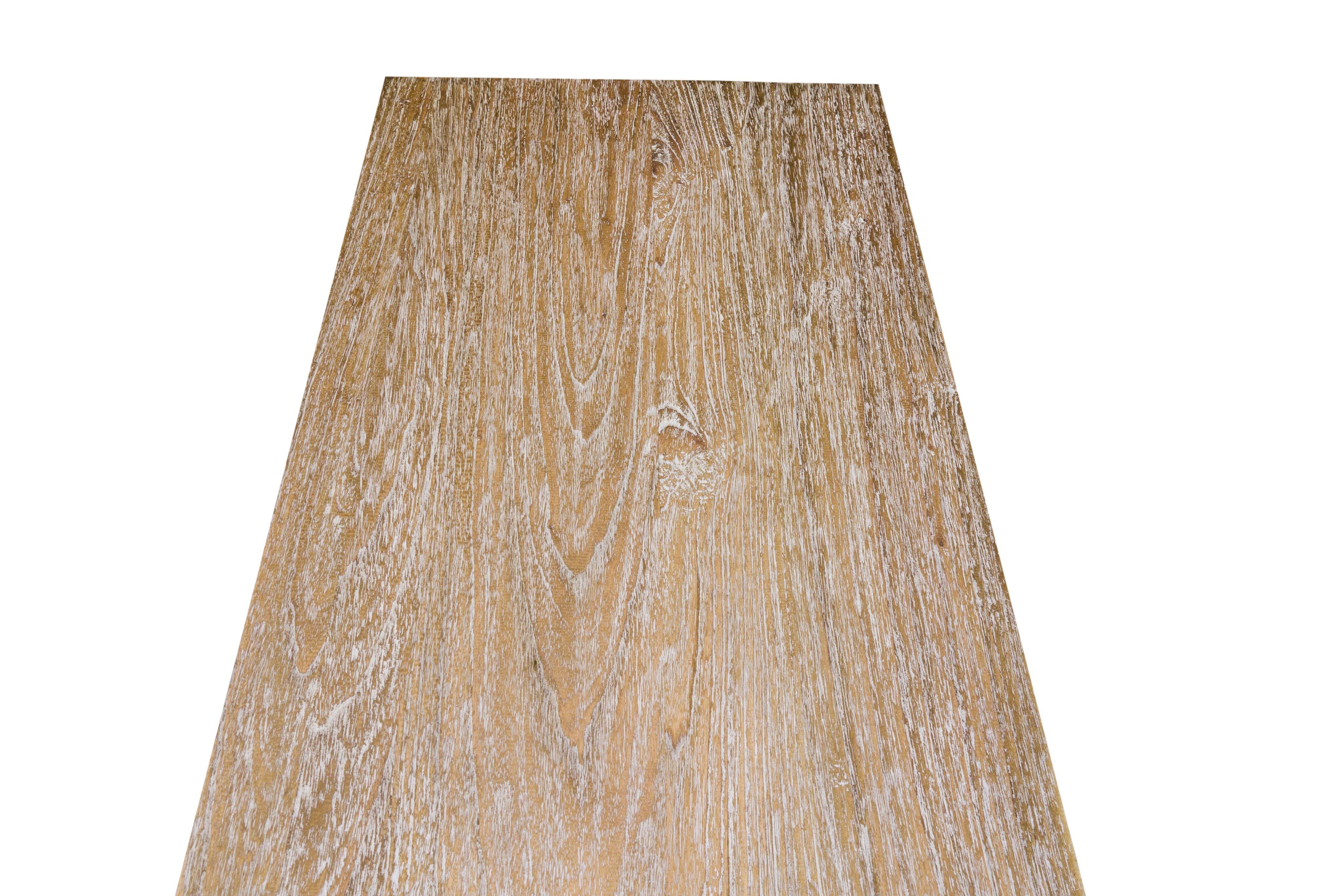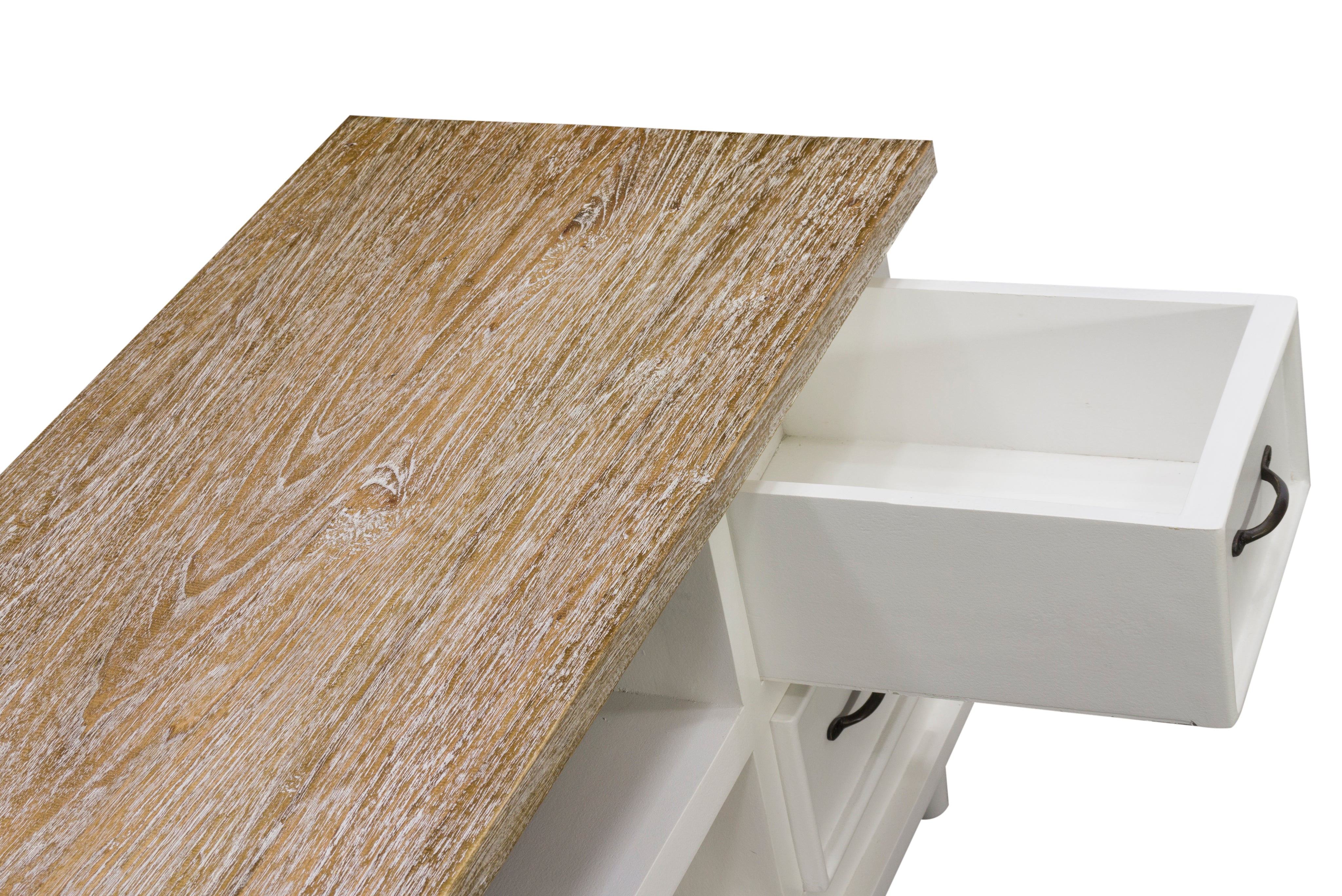 Combining antique white paint with whitewashed roughsawn tops, the result is a mix of subtle shades and textures that create a laid back beach house style.