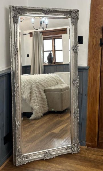 Extravagant 3.5inch framed silver wall mirror adds style to any room from the living room to a hallway. With ornate detailing in all four corners and sides this is a gorgeous piece ideal for any room from bedroom to lounge.